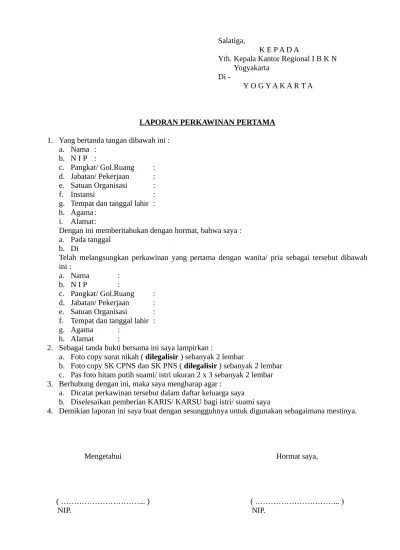 Contoh Format Laporan Perkawinan Pertama Pns / 2 - Contoh surat lamaran perihal :. Yang bertanda tangan di bawah ini : Pdf télécharger format laporan perkawinan pertama bkn contoh pengisian laporan. Fotokopi surat nikah / akta perkawinan (dilegalisir); Baping rt 09 rw 06, kel.susukan, kec. Pns foto wajib mengenakan pakaian waskat.