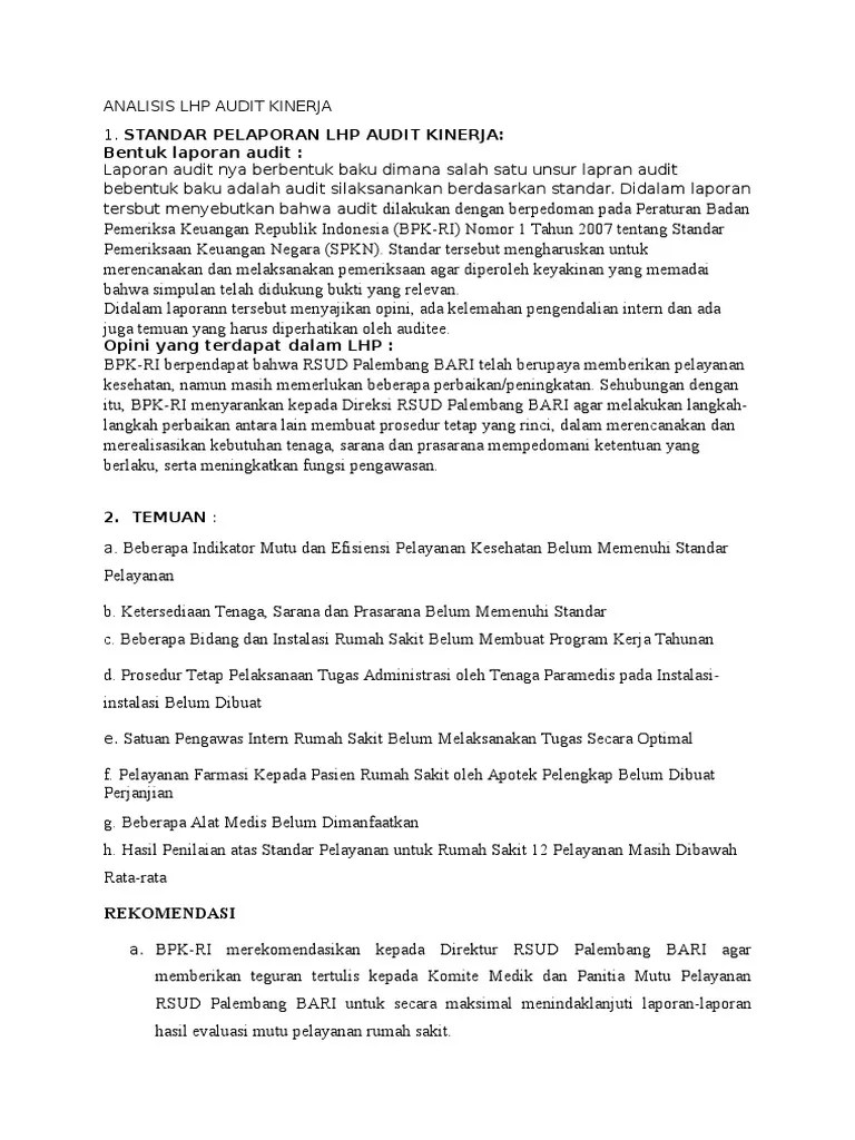 Struktur organisasi inspektorat jenderal dapat disajikan dalam gambar sebagai berikut :. Bagian analisa dan tindak lanjut laporan hasil audit. Pengawasan tersebut didukung dengan sumber daya keuangan yang memadai. Dasar pelaksanaan bimtek audit kinerja berdasar dpa skpd. Format laporan hasil audit kinerja pelayanan bidang kesehatan kabupaten natuna.