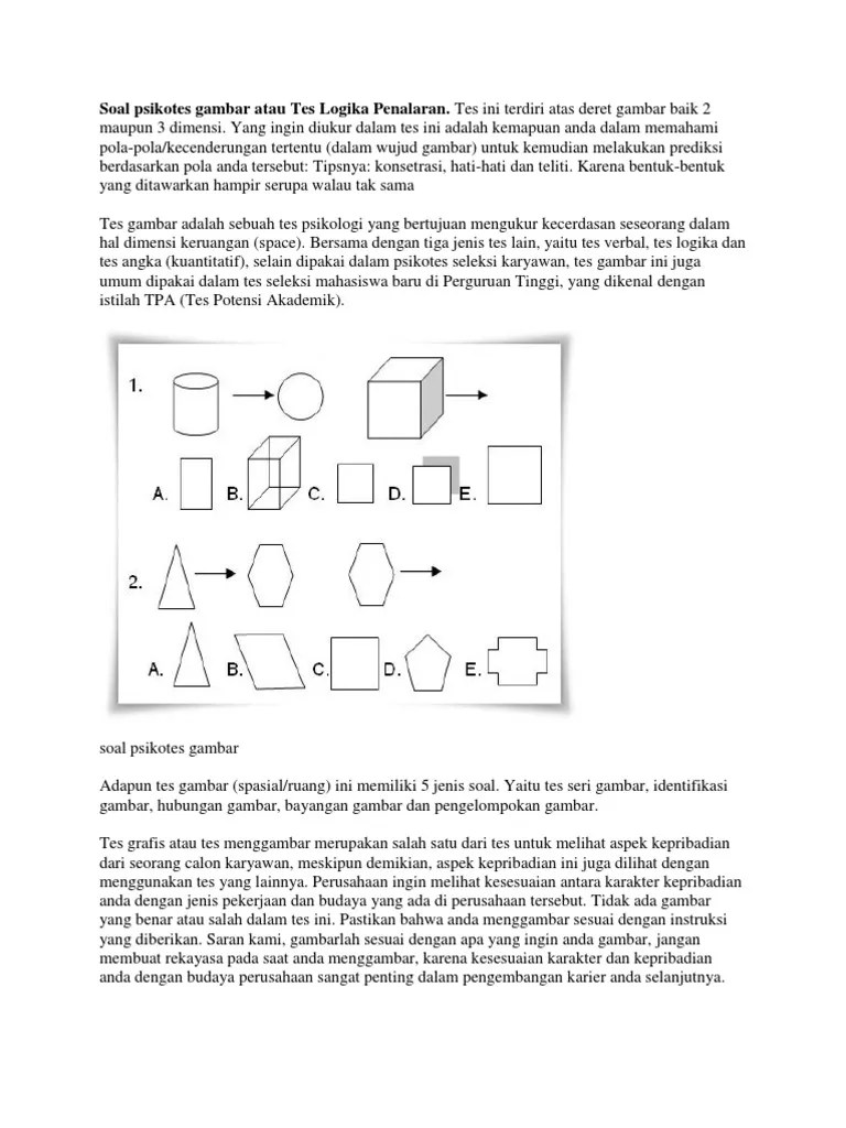 Tes ini terdiri atas deret gambar baik 2 maupun 3 dimensi. 1 soal psikotes gambar atau tes logika penalaran. Yang ingin diukur dalam tes ini adalah kemapuan . Tes soal psikotes menjadi salah satu bentuk seleksi untuk masuk pekerjaan. Soal psikotes umumunya berupa tes logika gambar (soal logika tes), psikotes deret gambar (tes deret gambar), tes logika penalaran, soal aritmatika. Kalian juga harus ingat tentang batasan waktu yang sudah di tentukan. Salah satunya adalah tes psikologi penalaran logika gambar atau psikotes deret gambar. Soal psikotes gambar atau tes logika penalaran. Tes ini terdiri atas deret gambar baik 2 maupun 3 dimensi. Tes psikotes deret gambar ini terdiri dari deret gambar 2 dan 3 dimensi, paling sering digunakan pada saat melamar menjadi karyawan bank, akuntan, konsultan, . Tes logika penalaran (deret gambar) secara konsep sama dengan tes logika aritmatika (deret angka), hanya saja dalam tes ini. Soal psikotes umumunya berupa tes logika gambar soal logika tes psikotes deret gambar tes deret gambar tes logika penalaran soal aritmatika tes mecocokkan . Tes logika penalaran (deret gambar) secara konsep sama dengan tes logika aritmatika (deret angka), .